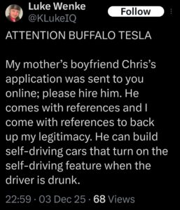 “I could Pro Se sue in the federal courts anywhere in the country. I could pay suicidal drug addicts from Olean’s Genesis House in cash to drive UHauls into Buffalo Tesla. I could write letters mindlessly to every single US Appeals Court across the country telling them to wake up about social media monopoly and trust law violations taking place.